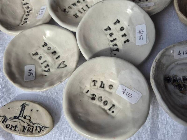 Our mini bowls are made from Terracotta and glazed in a delicious white thick gloss glaze with a smooth oozing texture not unlike snow or icing. Or, there is a choice of a smooth, white porcelain clay body finish with word inscriptions, such as, "Warrnambool". A very popular choice!